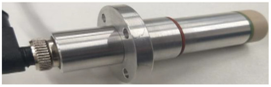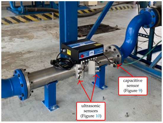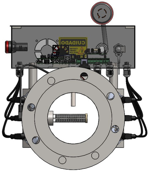 The sensor must be installed in a transversal section of the pipeline, as presented in Figure 3. Its sensitive region is limited to the metallic disks that will be filled with the fluid. The length of this sensitive region is 8 cm.