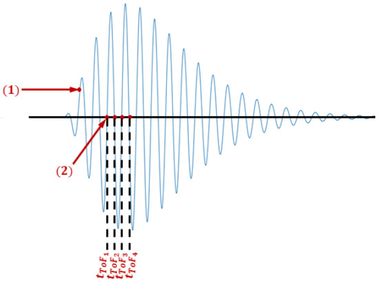 The technique used to measure the ultrasonic wave propagation times is based on the zero-crossing detection [48] of the pulses at the receivers. Figure 5 presents the detection of the zero-crossing of an ultrasonic wave. After the transmission of the ultrasonic pulse, the FPGA starts counting the time of several zero-crossings at the receiver. In order to avoid any initial transient, the first cycles are skipped. This is performed by detecting a pre-defined threshold (indicated by (1) in the figure). After the threshold, more three zero-crossings are skipped (until the first valid zero-crossing, indicated by (2) at the figure). Then the time from the starting of the pulse until next M number of zero-crossings ( until ) are computed. The average time of the valid zero crossings is calculated (recursively) using Equation (9).