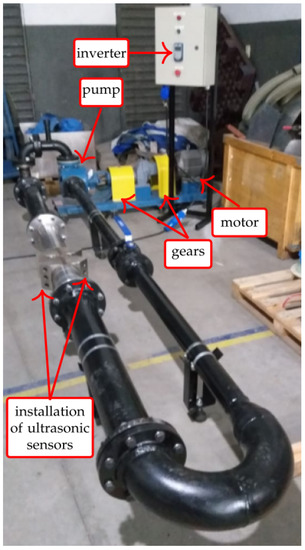 In order to evaluate the ultrasonic system, a reduced scale flow setup has been assembled, as presented in Figure 7. This setup is formed by a pump driven by an electric motor (whose speed is controlled by an inverter) and a closed loop hydraulic system.