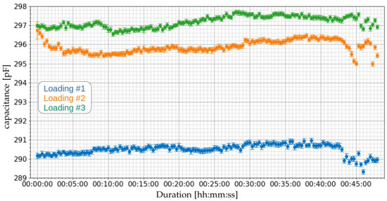 The permittivity of water is approximately 40 times greater than the permittivity of the fuel oil [40,41]—hence, the greater the water content in the emulsion, the greater its measured capacitance will be.
