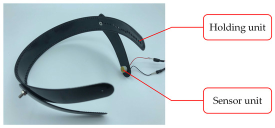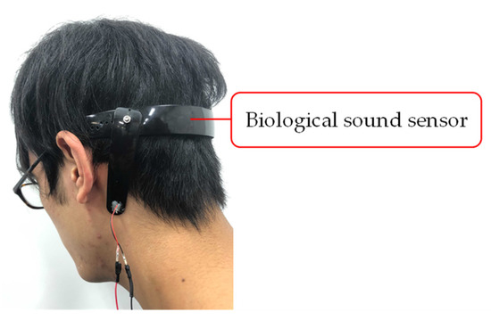We decided to measure the biological sound around the mastoid process of the subjects. The mastoid process is a cone-shaped bony prominence located in the posterior inferior portion of the temporal bone [32]. This position enables simultaneous measurement of vascular and respiratory sounds because of its proximity to blood vessels and the trachea. Furthermore, it alleviates the discomfort felt by the user when wearing the sensor. Figure 4 shows a photograph of a subject wearing the biological sound sensor.