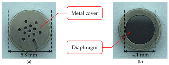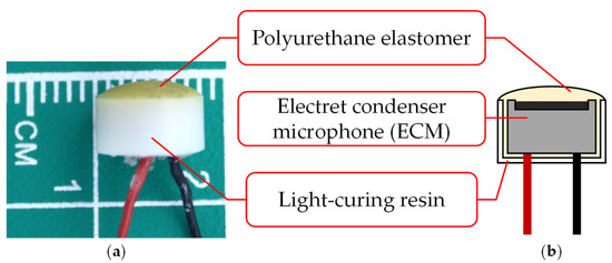 The biological sound sensor shown in Figure 1 is a wearable sensor that can measure vascular and respiratory sounds [14]. The sensor used in this study consists of two parts: a holding unit and a sensor unit. Figure 2 shows the photograph and cross-sectional illustration of the sensor unit. The holding unit is made of an elastoplastic material. The unit is designed to keep the sensor unit in contact with the human body. The sensor unit consists of an electret condenser microphone (ECM), a contact part, and a case. The ECM EM-258 (Primo Co., Ltd., Tokyo, Japan) was designed with its diaphragm exposed to accurately measure biological sounds. Figure 3 shows the ECM before and after exposure. The ECM is housed in a light-curing resin case, and its exposed diaphragm is covered with a polyurethane elastomer with a hardness of 15 HITOHADA gel (Exseal Co., Ltd., Gifu, Japan).