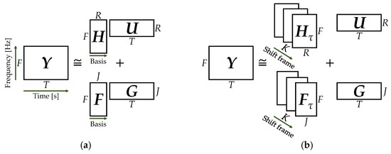 NMF is a method for decomposing non-negative data into additive components [21,22,23]. Based on previous studies, additivity is assumed valid in an amplitude spectrogram, which is an absolute value of the audio signal processed by short-time Fourier transform (STFT). Given a non-negative matrix Y ∈ , NMF approximates it by the product Y ≅ HU of a basis matrix H ∈ and an activation matrix U ∈ , where the input Y is the amplitude spectrogram of the audio signal, F is the number of frequency bins, T is the number of frames, and R is the number of bases of the NMF. H contains the spectral patterns found in the original spectrogram and U contains the time variation of the amplitude of each spectral pattern. The computational complexity and decomposition accuracy of NMF depend on an objective function that represents the norm between the target matrix and the output.