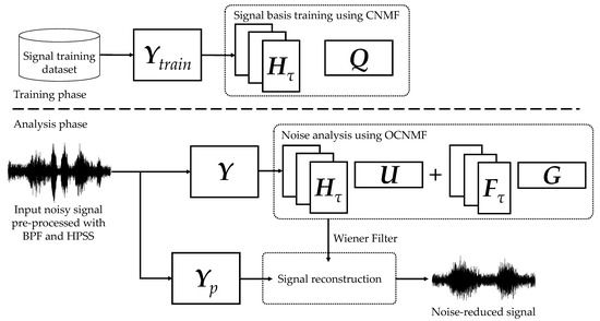 Target signal extraction methods have been devised using the spectral patterns of the signal as supervised information [36,37,38]. Semi-supervised NMF (SNMF) is an extension of NMF to supervised clustering. SNMF consists of two phases: pre-training and noise analysis. In pre-training, the amplitude spectrogram Ytarget ∈ of the target signal sound without noise is decomposed to the product of H ∈ and Q ∈ through NMF. The basis matrix H is incorporated into the NMF as supervised information for the target signal. In noise analysis, Q is not necessary because it represents the activity level of the pre-trained sound. SNMF decomposes the amplitude spectrogram Y ∈ of the unknown mixed signal, as shown in the following equation: