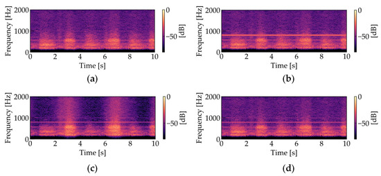 Amplitude spectrograms of respiratory sounds (The parameters were set as follows: sampling frequency = 44.1 kHz, window length in STFT = 1024 points, window length in STFT = 512 points): (a) noiseless; (b) noise-added; (c) processed with SCNMF (R = 30, J = 15, K = 10, = 200, = 200, β = 2); (d) processed with the proposed OCNMF (R = 30, J = 15, K = 10, = 200, = 200, β = 2, = 1.0 × 106).