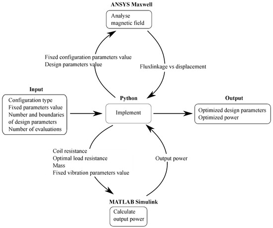 The implementation of the whole procedure is outlined in Figure 7. The optimization process can be executed in a fully automated manner, with no requirements on users to adjust the design parameters manually. Users input a set of desirable parameters in order to configure the optimization process. These parameters include (i) the configuration type to guide the optimization system to select the right model for the investigation; (ii) fixed configuration and vibration parameters to input to Maxwell and Simulink models, respectively; (iii) the number of design parameters and corresponding boundaries to facilitate the steps of generating initial design parameters and creating new points; and (iv) the number of evaluations as a stop criterion. Afterwards, users only need wait to obtain the optimized output values. In the Python environment, the design parameter values are first initiated and then sent to Maxwell for magnetic field analysis. Then the result plot of flux linkage versus displacement is routed back to Python for electromagnetic coupling coefficient calculation. The computed coupling coefficient, together with other variables needed for the Simulink model, are then sent to Simulink for power calculation and the result is fed back to Python. The optimization implementation in Python will then continue based on the obtained output power from Simulink and current design parameter values. The procedure is repeated until the specified number of iterations is reached.