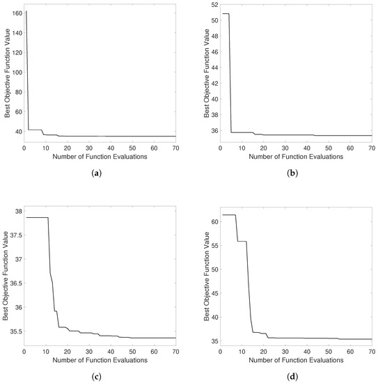 The next investigation is to optimize the output power of the four harvester configurations based on variable design parameters. Figure 9 shows the plots of the best objective function value versus the number of iterations for each configuration. The objective function value in our study was set to be the inverse of the output power. Thus, the optimization target is to minimize the objective function. The maximum number of iterations was set to 70, and it can be seen that the optimization algorithm converges after a certain number of function evaluations. The converged values are 34.939, 35.337, 35.360, and 35.365, respectively.