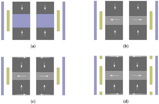 In this study, four coil–magnet configurations are investigated and compared in terms of output power performance of the corresponding harvesters. The details of each configuration are shown in Figure 4. As shown in the figure, these configurations have different number of magnets and coils, as well as different magnet arrangements. The first configuration (DM1S1C) has two magnets with like-poles facing each other and a mild steel used as a spacer, which aims to concentrate the magnetic field flow. Only one coil is used in this configuration. The other configurations utilize Halbach arrays in the magnetic structure with different numbers of magnet. These configurations are a Halbach array with three magnets and one coil (H3M1C), a Halbach array with five magnet and one coil (H5M1C), and a Halbach array with five magnets and three coils (H5M3C). All the coil–magnet structures are surrounded by a back shield, which guides the magnetic flux and minimizes the flux leakage. The magnetic field line direction inside the magnet is indicated as an arrow with the direction from south to north. We refer to the magnets as radial magnets or axial magnets depending on whether their direction is in line with the harvester’s axis or orthogonal to it. Since the configurations are symmetrical, the coil (in case of one-coil configuration) or the center coil (in case of multi-coil configuration) is aligned with either the spacer or the center radial magnet for the best efficiency.