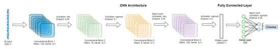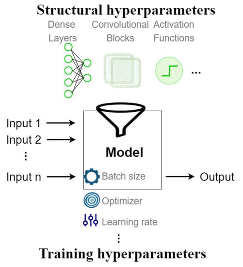 A CNN architecture (depicted in Figure 1) is defined by a set of hyperparameters, namely structural and training hyperparameters. The structure hyperparameters are the number of layers, number of units in each layer, kernel size, number of filters, stride, pooling, normalisation techniques, and activation functions. The training hyperparameters are the optimiser, learning rate, momentum, batch size, initial weights, epochs, and patience (for early stopping method) [31,32].
