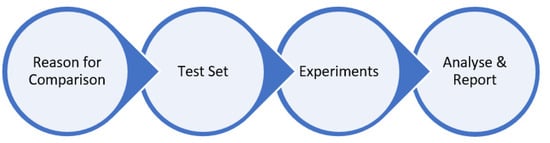 It is quite common to find structured methods or processes on business companies, e.g., for comparing, assessing, and/or measuring different perspectives such as product offers or sales, personal performance, or financial ratios. Nevertheless, it becomes difficult to find processes or best practices for optimisation algorithm comparison. After a thorough literature review, the decision was based on the recent framework presented by Vahid Beiranvand et al. in the article “Best Practices for Comparing Optimisation Algorithms”, which was created for helping researchers to design a proper comparison approach. To the best of our knowledge, this work is the most relevant in the area [38,39]. The proposed framework consists of the following phases (Figure 3):