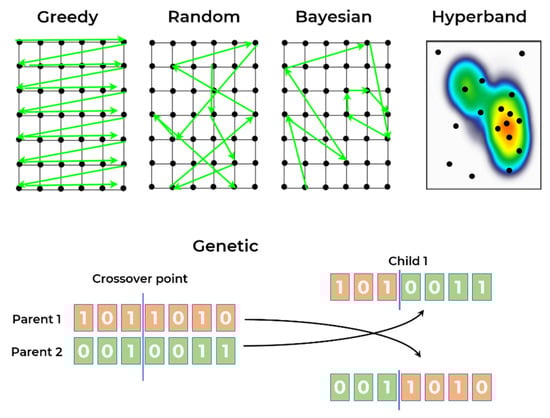 The performance of a CNN is critically sensitive to the architectural design and differs for each problem/challenge, leading to a difficult task of finding the appropriate hyperparameter values and their combination. It becomes even harder to understand network hyperparameters relations and their impact on the model’s performance. Since there is no mathematical formula for calculating the appropriate hyperparameters combination, it is common to find the grid search or random search as strategies to optimise the architecture. These strategies present some drawbacks, such as high usage of computational resources and non-directional (“dummy”) search for the optimal solution. Even with these strategies, there is also no guarantee that the resulting model is the best solution. More recently, Bayesian optimisation methods and genetic algorithms have been considered by the scientific community as approaches to optimise the architecture, but still with quite limited experiments [31,33].