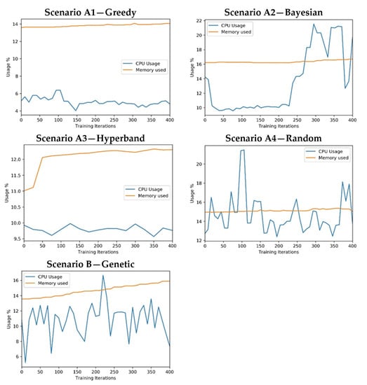 The current comparison process includes the monitoring of computational resource consumption. In Figure 12, it is possible to find CPU and GPU resource consumption, including GPU memory, for each scenario. The resource consumption was analysed for each scenario considering all 25 experiments. By analysing the CPU and GPU monitoring results on different experiments, similar results were obtained, so it was decided to provide a resource monitoring sample for each scenario. Based on the CPU consumption, the vertical axis in the figures shows the percentage of the CPU used.
