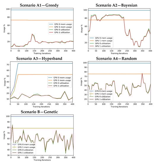 - All approaches used the same training process that uses all the available GPU memory. For this reason, the approaches have a similar memory consumption (note that some of the GPU-1 memory is reserved for system tasks). The exception can be found in the A3 scenario, which starts with a few epochs in every training session and then reduces the number of trained models.