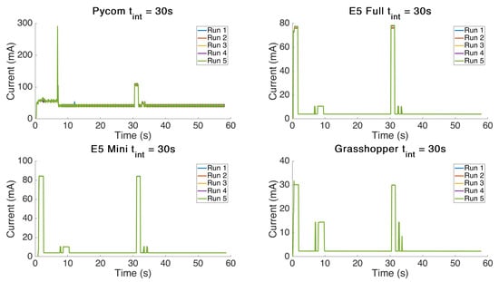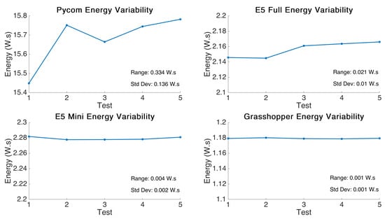 In order to analyse how repeatable the power consumption required for the test was, repeats were carried out and the plots for this test are shown in Figure 2. It can be concluded that multiple tests show very little variance in the power profile consumed to accomplish the same task and there is very little variability. However, the Pycom board showed greater variability with a standard deviation of 0.14 W·s as compared to an average deviation of 0.004 W·s for the other boards.