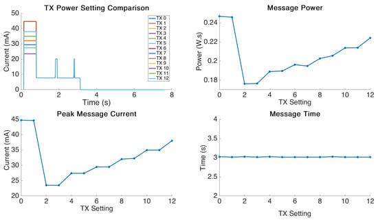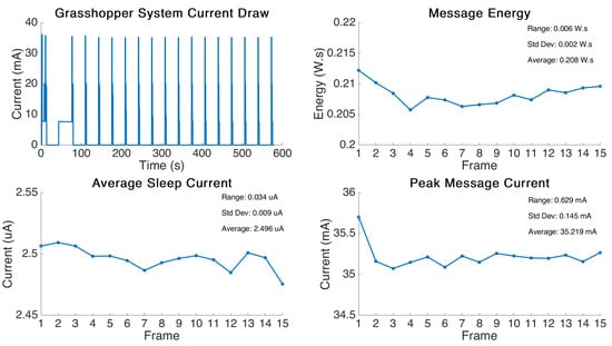 The graphical results from the test are displayed in Figure 4. This test was performed slightly different to the one earlier in the Multiple Boards Comparison section. The Grasshopper board was programmed to send a consistent 2 Byte message at an interval of 30 s. The period in between the messages was this time configured to be “deep sleep” state. This allowed us to analyse the sleeping current required in this state in the period in between message transmittals. The results were then post processed in Matlab to find the message power variance, peak message current, and average sleep current.