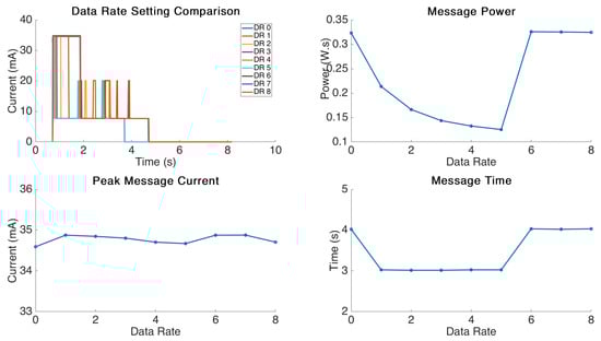 Looking at the power profile delivered from the tests we can see some interesting behaviour. The message power required ultimately reduces with valid increases in the DR setting. This shows good agreement with the results published in other works on this topic [15,16,17]. We can further see that as the transmission bit rate increases there is a staged reduction in message delivery timing from approximately 4 s down to 3 s. This decrease in message time is not linear and instead only steps down to a faster message time at DR1 and then stays static at the 4 s mark. These are likely agreed timings set in the LoRa protocol.