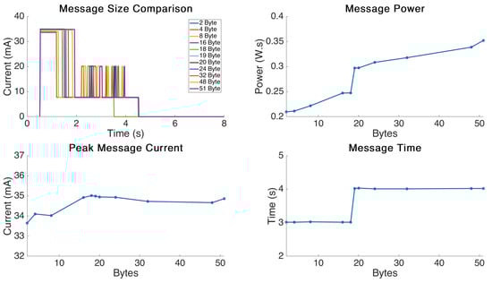 The message power showed a linear increase with message size up to the threshold value of 19 Bytes and then a significant jump caused by the opening of the longer transmission window. It then showed a similar linear increase from 19 Bytes to the maximum tested value of 51 Bytes.