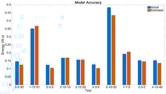 Once the model had been generated based on the testing results, we verified its accuracy using further testing. Input parameters spread over the ranges were randomly selected and and an estimate recorded. The parameters were then compiled and uploaded to the boards and each test point was compared to the experimentally recorded measurement.