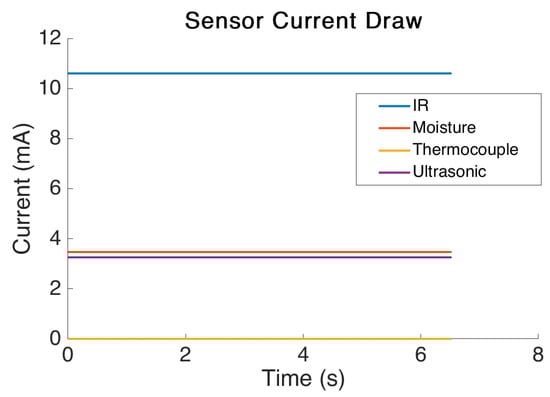 The static power draw test results are shown in Figure 9. From the results it is clear that the sensors use an extremely small amount of power. The IR sensor used the most power with an average power draw of 10.6 mA. The lowest power sensor tested was the digital thermocouple which used only 0.5 μA of current to power the onboard chip. This figure is the power draw during operation and each sensor utilised must be considered for how long it actually requires being operated. For example, there is no necessity to power a moisture sensor after a reading has taken place but there may be a minimum amount of time it must be powered before an accurate reading can be obtained.