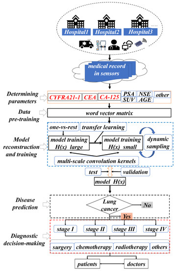 During the diagnosis and decision-making process of NSCLC patients via intelligent medical systems, the general process consists of five parts (as shown in Figure 1): determining parameters, data pre-training, model reconstruction and training, disease prediction, and diagnostic decision-making.