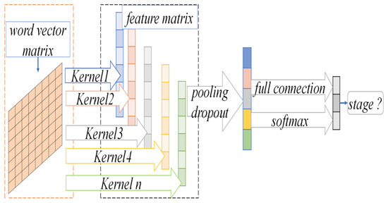 In the CNN-based binary classification staging prediction model, the text in the medical record was split into word sequences by word processing. Then, word vectors of the words were pre-trained on medical-related diagnostic and decision parameter text data using Word2Vector’s Skip-gram model to represent discrete word symbols as semantic vectors in a low-dimensional continuous space. Next, after expressing each word of the case as its word vector, a two-dimensional word vector matrix expressing the case was obtained. Finally, the convolutional and pooling operations of CNN were used to extract features from the word vector matrix of cases and perform the binary classification of the four pathological stages. The structure diagram of the NSCLC staging prediction model based on CNN is given in Figure 2.