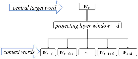 Equation (1) shows the maximized log-likelihood function. where represents the conditional probability of generating a context word with the given target center word , and denotes the set of all context words within window . The structure diagram of the Skip-gram model is shown in Figure 3.