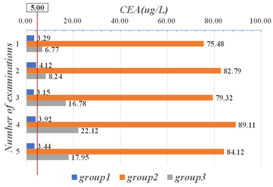 As shown in Figure 7, the mean CEA data for the first group of patients were normal for all five examinations. In contrast, in the second and third groups, the mean of five CEA examinations was outside its normal range in both groups [0, 5.00]. In particular, the values in the second group all exceeded the maximum critical value (50 μg/L) of the normal range by more than ten times, which means that the patients in this group were seriously ill.