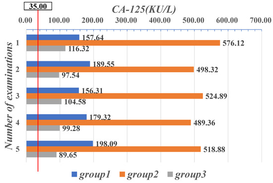 In all three groups, the mean values of the patients’ CA-125 examined were over the normal range [0, 35.00]. In particular, the mean CA-125 values of the patients in the second group were all over 480 (KU/L), which means that the mean values were more than ten times greater than the highest threshold of their normal range, as shown in Figure 8. It is clear that patients in the second group had mean values for both diagnostic and decision-making parameters, CEA and CA-125, that were well outside their respective normal ranges, which indicates that the patients’ conditions may have deteriorated severely or even progressed to the advanced stage of the disease.