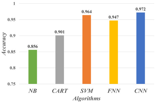 To evaluate the performance of the CNN-based deep learning algorithm for the NSCLC staging prediction model in this paper, we additionally conducted comparative experiments on staging prediction using Naïve Bayes (NB), Classification And Regression Tree (CART), Support Vector Machines (SVM), and Feedforward Neural Network (FNN). Figure 10 show the prediction accuracy of these five learning algorithms. The CNN model shows the best performance in the classification recognition of the sampled data samples, proving the powerful learning and recognition ability of CNN for text semantic features.