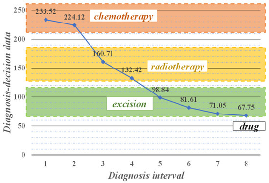 Upon initial diagnosis, the decision value calculated by the system was as high as 233.52 greater than the maximum critical value of 180 in the normal range, indicating that the patient’s NSCLC was in stage IV, which was more serious, and the system recommended chemotherapy strategy. After the physician administered two cycles of chemotherapy to the patient, the system recalculated and analyzed that the decision value decreased and was less than 180, and the patient was in stage III, at which point the recommended treatment strategy was adjusted to radiation therapy because chemotherapy is harmful to the patient’s body and should not be performed for a long time. After two more radiotherapy cycles, the parameter values decreased to between 58 and 119. This indicates that the condition of the patient was in remission and in stage II of NSCLC, which was excised by surgery on removable lesion tissue. The decision value dropped to 67.75 at the eighth diagnosis, at which point the main recommendation was drugs for late treatment. With the help of the assisted diagnosis and decision-making intelligent medical system, doctors can qualitatively analyze the condition of NSCLC patients throughout the whole process. Based on the system’s recommendation of specific and effective treatment strategies after each disease monitoring, the doctor can make accurate decisions and track the patient’s treatment in real-time, thus reducing the patient’s pain during the treatment process and effectively saving the patient’s life.