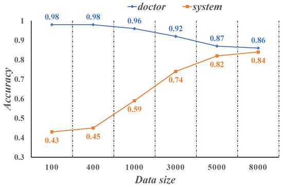 Figure 12 show the diagnostic accuracy of the physician compared to the intelligent medical system we developed on the sample of NSCLC patient cases. Physician accuracy is as high as 98% when the case sample data size is between 100–500, while the system is only 45% accurate. The accuracy of the system is close to 60% when the case sample data size is 1000. As the case sample data size increases and reaches roughly 5000, the system’s diagnostic correct rate is already as high as 82%, while the doctor’s diagnostic correct rate drops to 87%. When the case sample size reaches 8000, the accuracy of the system is 84%, which is close to the doctor’s diagnostic accuracy of 86%. It can be seen that when the size of the training case sample is large enough, the system can diagnose patients with NSCLC with an accuracy comparable to that of clinicians.