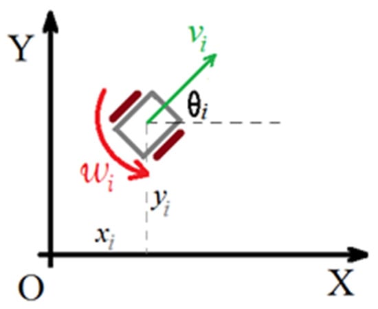 A schematic of a WMR is shown in Figure 2. Following [], the kinematic model of the ith WMR with two degrees of freedom can be written as follows