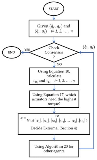 The whole algorithm is shown in Figure 3. Using the diagonal coefficient matrix  in Equation (16), at least one of the right or left motors of the follower robots works at a maximum angular acceleration or deceleration. Therefore, the bang-bang controls take their extremals throughout the whole motion to minimise the manoeuvre time.