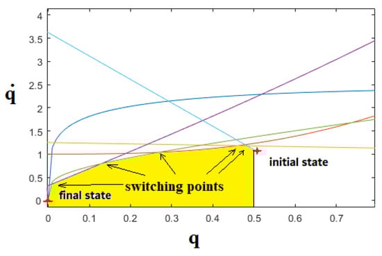 Following the  calculation step, the optimal control problem is now to find a control strategy to transfer the system state from the initial to the desired final state, in the least time (Figure 4). Since the Pontryagin principle demonstrates that at any point of a time-optimal trajectory, at least one of the actuators exerts a maximum or minimum input, the problem of finding the optimal control is reduced to finding the switching points. Therefore, the trajectory must be at each point tangent to one of the eight extremals described in Section 3, at least for one of the robots. Figure 5 shows an example of using the proposed algorithm. As can be seen, there are several switching points that occurred between actuators and extremals.