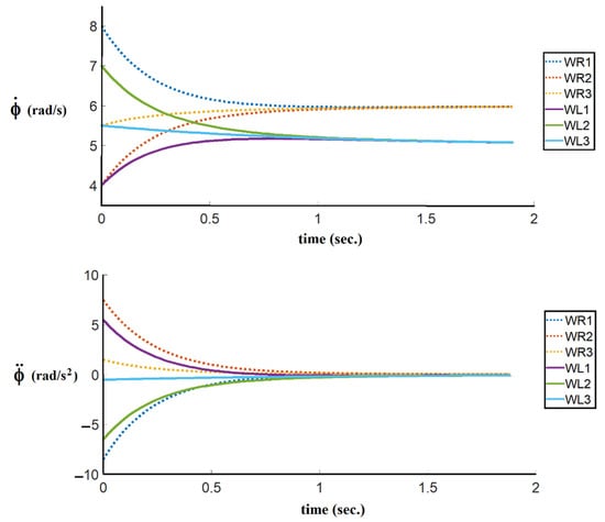 The results of the right and the left angular velocities and angular accelerations of followers without the time-optimal control coefficient.