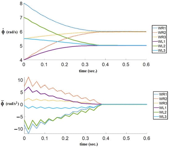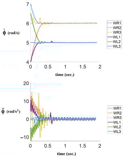 Using Equations (5)–(8) the right and left wheel angular accelerations are