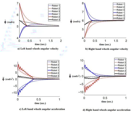 The comparison results of the right and the left angular velocities and angular accelerations of followers with and without the time-optimal control coefficient; (a,b) show the left and right hand wheels angular velocities respectively; (c,d) show the left and right angular accelerations; dashed lines show the results of the consensus algorithm, and solid lines show the results of the proposed time-optimal control consensus algorithm.