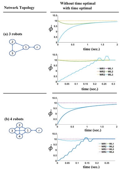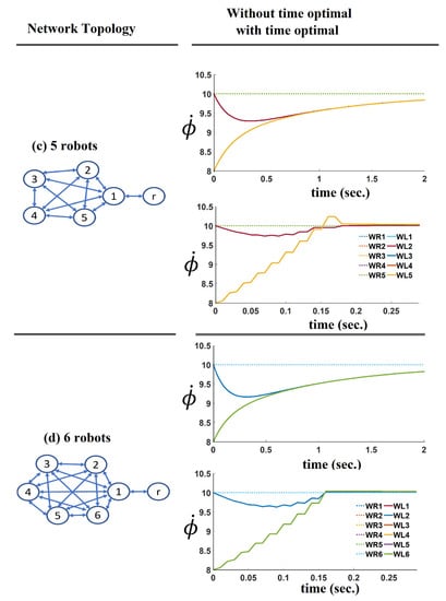 Comparing the results achieved in this section (shown in Figure 10 and Figure 11), it can be concluded that the convergence time is mainly influenced by two factors i.e., the number of robots in the network and also the network topology. However, as examined, the proposed time-optimal method is efficient if used when both of these factors are changed and it dramatically reduces the convergence time.