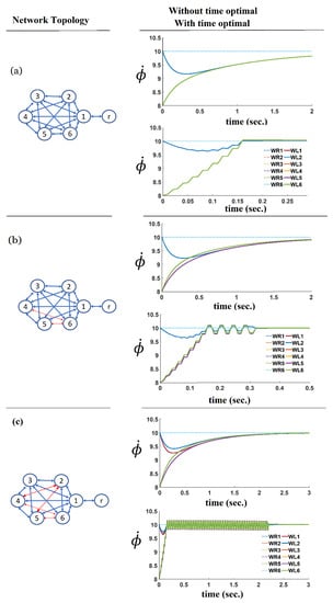 In the first simulation, where the time-optimal control strategy is not considered, the consensus velocity tracking algorithm is used whereas the time-optimal coefficient  is equal to 1, and the diagonal matrix  is chosen as the identity matrix. As can be seen in Figure 6, the angular velocities and angular accelerations reach a consensus in 1.5 s.