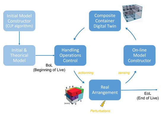 In this context, the virtualization of containers necessarily involves a step to collect data. To do this, and succinctly (see [5] for more information), we will consider that each container has a wireless sensor network (WSN) node attached to one of its vertices. This node carries at least information about the identifier of the container, its dimensions, and the identifier of the composite in which it is to be inserted. The assembly of different containers within a higher-level container (which we will call “composite container”) makes it possible to constitute an ad-hoc sensors network. The different nodes of this network can then communicate within a certain coverage radius (adjustable parameter of each node by adjusting the radio transmission power) and are able to generate a list of their neighbors (nodes present inside the coverage radius). This information makes it possible to establish a global neighborhood graph (or proximity graph) between all the containers. It will be taken into account by our model. Thus, at any place and at any time, this proximity information may be available and therefore be used to establish the 3D digital twin of the arrangement. Our solution can thus be used for different purposes during the life cycle of the composite container (e.g., full or partial unloading, replenishment, etc.). Figure 1 shows this general process.