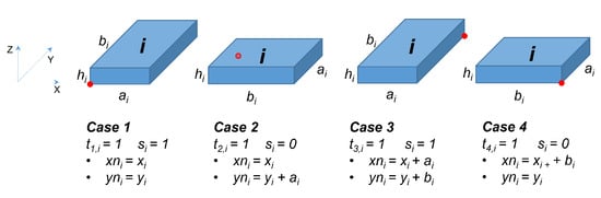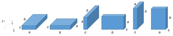A parallelepiped container of dimensions (with with its edges parallel to the three axis of a Cartesian coordinate system can occupy 6 different volumes in the 3D space [25]. Figure 2 illustrates these 6 different cases.