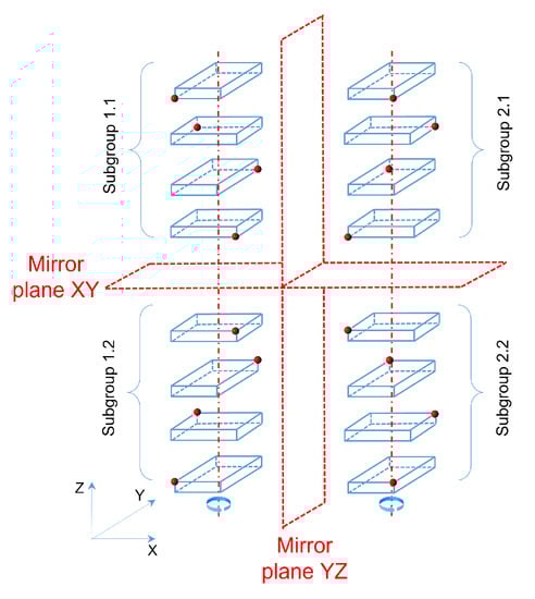 The asymmetry (mirror effect) between the subgroups 1.1 and 2.1, 1.2 and 2.2 with regard to the plan , and between the subgroups 1.1 and 1.2, 2.1 and 2.2 with regard to the plan (Figure 3), makes impossible the passage by diverse rotations of any figure of one of these subgroups to those of another one: the figures are chiral. This is bound to their instrumentation, which can be realized by two different manners.