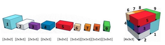 - Let be a parallelepiped physical composite container of known dimensions () with an identifier equal to 0. This volume corresponds to the maximum space that the containers (or items) can occupy after being arranged.