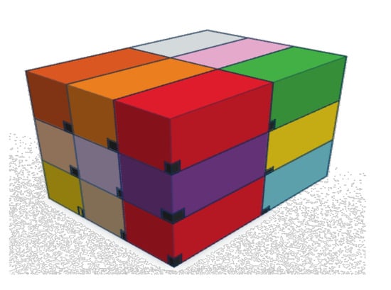 Here, the objectives are, in the first instance, to verify and validate the proposed model, but also, on the basis of an enumeration of the solutions, to study the simple possibilities of reducing their number. To do this, we will rely on three different scenarios of arrangement. The first one is a classic case of literature. This case, named Meller’s scenario [26], is shown Figure 5. It consists of nine containers of different dimensions where WSN nodes position is represented in black. This case is a widely used example in the Physical Internet community for various purposes, which is why we chose it. As our approach is completely new, there are no cases in the literature on which we can compare our results. This case was chosen because it presents containers of heterogeneous dimensions. The two other scenarios will be homogeneous cases consisting of 18 and 36 containers with identical dimensions (see Figure 6 for scenario with 18 containers). These two cases seem a priori less interesting from an application point of view, in particular if all containers are identical and embed the same products. However, the regularity of the container dimensions, or the homogeneity of the arrangements, is an interesting case to test the performance of our model.