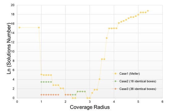 The first results concern the enumeration of the solutions obtained in the three test cases mentioned above, considering that the measurement uncertainty is zero ( or ) and with one single radius (no repetition of measurements, or m = 1). Different coverage radius has been tested over a range from 0.1 to 5.4 (length of the composite container diagonal), with a spatial sampling of 0.1. The results obtained are shown Figure 7 with a logarithmic scale. This confirms our initial results (see [5]) and shows the very strong influence of R on the number of solutions obtained. For low or high R values in relation to the relative dimensions of the containers, a combinatorial explosion can be observed: the containers either have no neighbors or all the containers are all neighbors. In these two cases, this information does not contribute anything, and neighborhood constraints do not in any way reduce the number of solutions obtained. In the Meller’s scenario, it is possible to find the real arrangement (only 1 solution for values of R = 2.3, R = 2.4, R = 2.9, R = 3.0) whereas in cases 2 and 3, at least 2 solutions can be established. The heterogeneity of the initial arrangement is an advantage in the approach we propose.