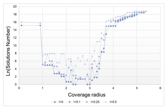 Influence of the uncertainty on the number of solutions according coverage radius (Meller’s scenario).