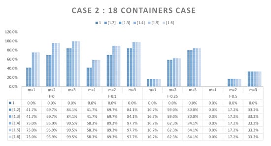 In order to reduce the number of solutions obtained, we propose here to add additional constraints for the resolution of the problem. Thus, we will consider that the neighborhood measurements carried out are repeated (constraints 12 and 13 of the proposed model) with different values of and (constraints 14 and 15). We will compare the results obtained with a single measurement () with those obtained for and . We have limited ourselves to 3 different radii, because these measurements have a cost in terms of time, but also because the combinatorics of the cases to be tested became too important. These tests were carried out on scenarios 1 and 2, with 9 and 18 containers respectively and R values between 2 and 3.1 (zone of interest obtained for these 2 cases). R varies with a step of 0.1, which gives us in the end 12 cases to test for , 66 cases for , and 220 cases for , (i.e., the number of combinations of 2 or 3 radius in the 12 possible radius). Finally, these different tests were repeated for uncertainty I values of 0, 0.1, 0.25 and 0.5. The results obtained are summarized Figure 9 and Figure 10. The two histograms illustrate the percentage of the number of solutions found for a given range in relation to the totality of solutions tested, and this for each of the uncertainties with , and . For example, the value of 58.3% (red circle in the figure) indicates that for an uncertainty of 0, with , 58.3% of all cases tested (i.e., 7 cases out of the 12 tested for a single radius) find one or two solutions. The value of 74.1% (green circle in figure) indicates that for an uncertainty at 0.25, with , 74.1% of all cases tested (163 cases out of the 220 tested for 3 radius) find one to three solutions. One can thus visualize the effect of taking into account several radii on the possibilities of obtaining a smaller quantity of solutions. In both cases, the influence of taking these additional constraints into account is very clear, even in the case where the uncertainty is the highest (). Nevertheless, there are still possibilities to obtain several solutions, and thus do not find the digital twin of the real arrangement.
