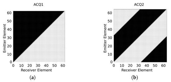 Each emitter/receiver pair and its associated signal correspond to a unique coarray element. By the reciprocity principle, it is easy to identify that and introduce equivalent information in the beamformer. By extending this principle, an acquisition strategy that reduces the number of signals by almost half can be used [24,27]. Figure 2a illustrates this strategy (), where each white square corresponds to one acquired signal. Moreover, the acquisition strategy can be rearranged to create the , shown in Figure 2b, which allows further reduction in the number of parallel channels by almost twice.