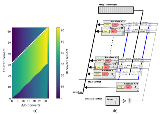 Using an array with 64 elements involves signals in the . By excluding the pulse-echo signals, there are signals, and using the reciprocity principle, , and only signals are needed for the different emitter/receiver pairs. Summing the 64 pulse-echo signals, results in 2080 signals. In Figure 2b, strategy reduces the number of signals involved from 4096 to 2080, and the number of receiver parallel channels from 64 to 33. This structure can be reorganised to obtain a simpler implementation, and Figure 3a illustrates a more compact representation of . Reciprocity allows to empty less than a half of the matrix, and we can make a rearrangement of the columns to reduce the number of converters. The acquisition strategy is organized in a matrix representation, where each shot (associated with a transmitter element) is represented in a row, and each column is tied to a specific converter in reception. Each colour of the cells indicates the number of the receiver transducer. As it can be seen, the last converter channel () handles the pulse-echo signals (), which means that, for this converter, 63 receiver changes will take place. For the other converters, we fill each column with the respective receiver to implement the acquisition strategy . For example, column 1 (converter 1) is filled at the bottom with the receiver 33 and changes to receiver 1 after the emitter 33. Using this strategy, the 32 first receivers share each one only two different elements, and the multiplexer is simplified. As converter needs to access all transducers, in order to avoid an extra multiplexing net, this channel can share the multiplexing structure with emission. In this implementation, there are switched-off receivers (white cells in Figure 3a) that occur because converter is in charge of these acquisitions.