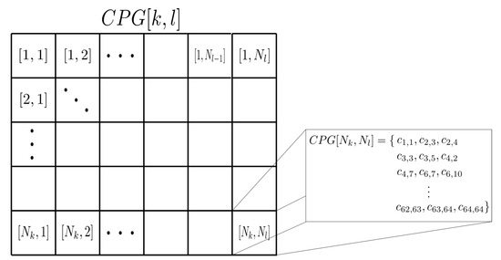 To make programming tasks easier, we propose to reorganise the structure in another matrix. Each [] position of this new matrix, named Inverse Coarray Projection Grid (), corresponds to the coarray element and, inside each position of this matrix, the different [] values that satisfy using the condition (4) will be stored.
